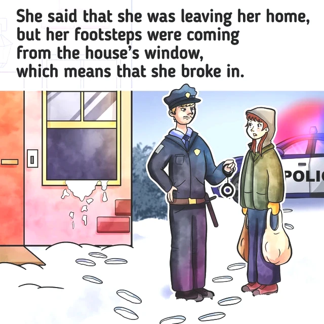 Cevap: Kadın evinden çıktığını iddia etmesine rağmen, ayak izleri onun camdan izinsiz girdiğini gösteriyor. Bu nedenle evin gerçek sahibi olmadığı açıktır.