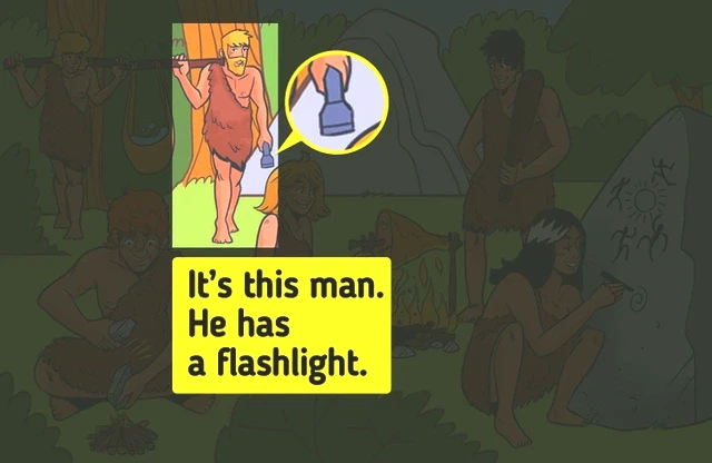 Cevap: Resmin arka planında sulama yapan iki adamdan sağ tarafta yer alan kişi, gelecekte yaşamaktadır. Diğer elinde odun taşımak yerine bir el feneri tutmaktadır.