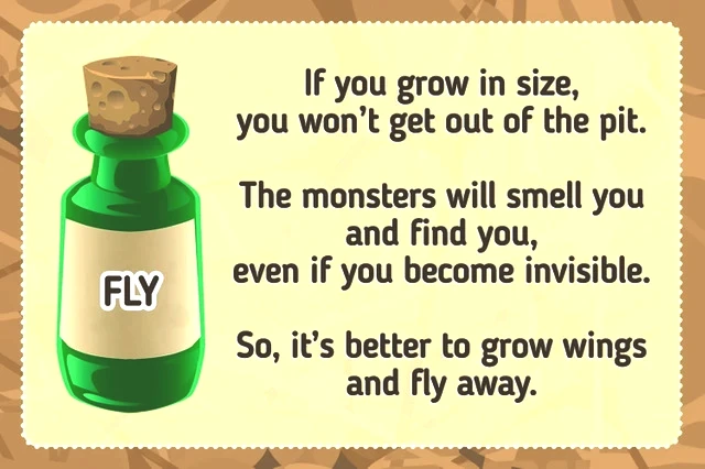Cevap: Eğer büyüme iksirini alırsanız çukurdan çıkmanız imkansız hale gelir. Görünmez olursanız bile canavarlar sizi koklayarak bulabilir. Bu durumda en akıllıca seçim, kanat veren iksiri seçip havalanarak kaçmaktır.